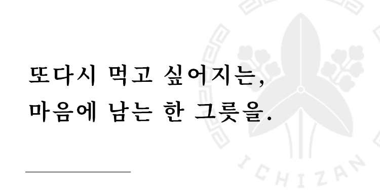 하얀색, 검은색, 노란색, 초록색으로 계절마다 변화하는 수프에 대나무 숯 오일로 「一」자를 그리는 연출은 「이치잔」의 상징입니다. 외형의 아름다움은 물론, 향기와 맛에도 그 계절만의 여운이 느껴집니다.